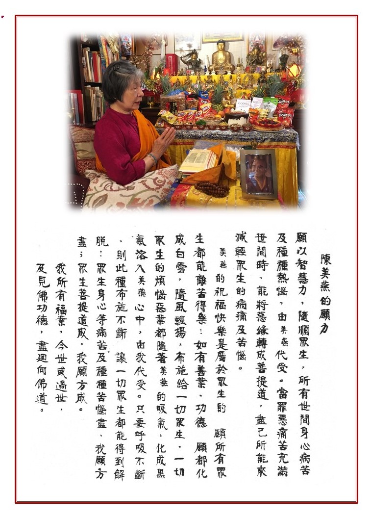多傑吉祥母 祈禱法會紀念多傑吉祥母 By WebMaster on 12 八月, 2019 七月九日是詠給妙覺佛教中心總裁和領導人多傑吉祥母往生ㄧ百天,中心舉辦紀念祈禱法會。同修以及親友們ㄧ起唱誦阿彌陀經、佛號迴向多傑吉祥母。法會圓滿之後,大家共享素食自助餐。 Dorje Palmo Amitabha Chanting Chanting Prayers 多傑吉祥母的發願文 相關 分類:多傑吉祥母