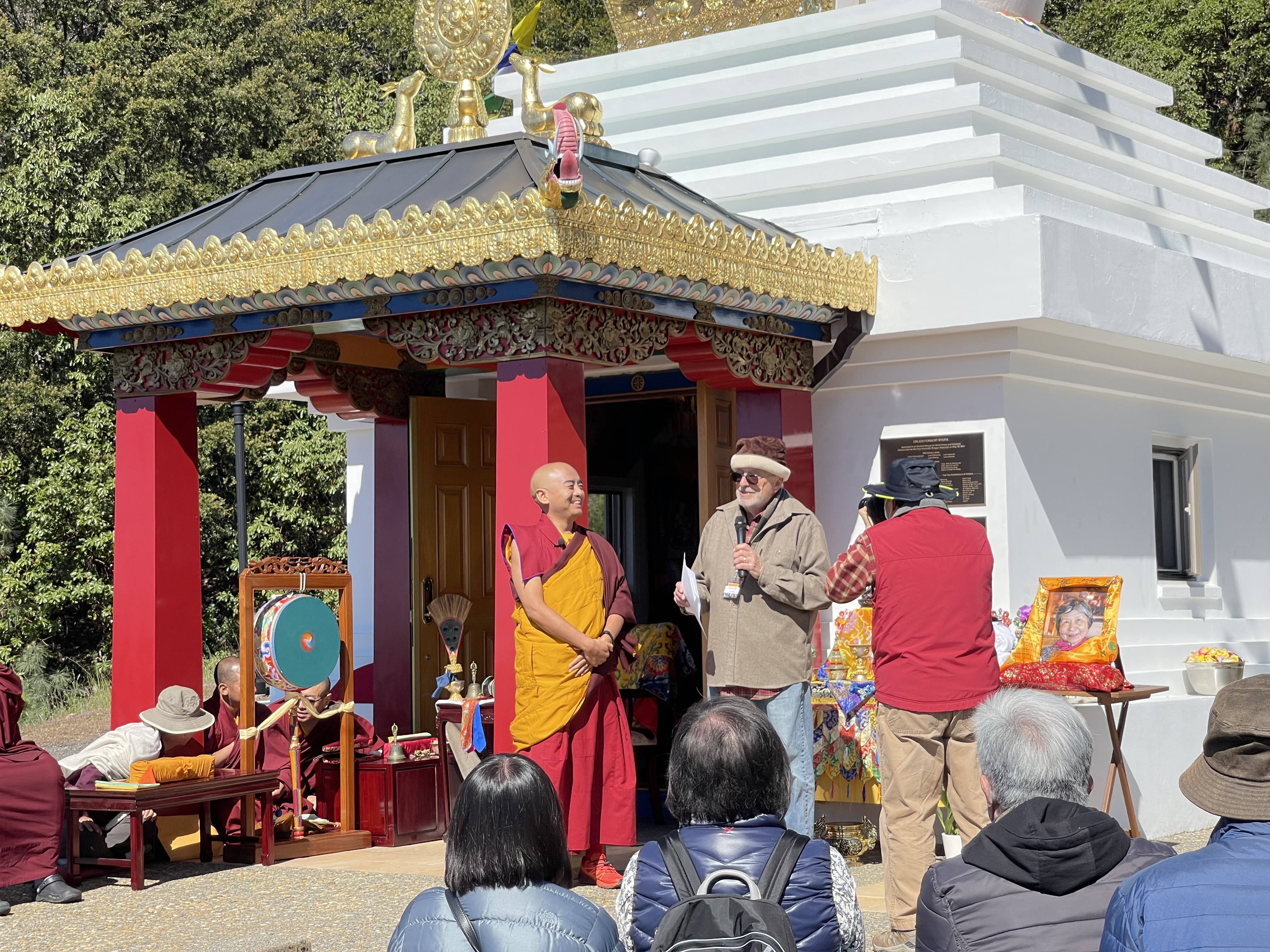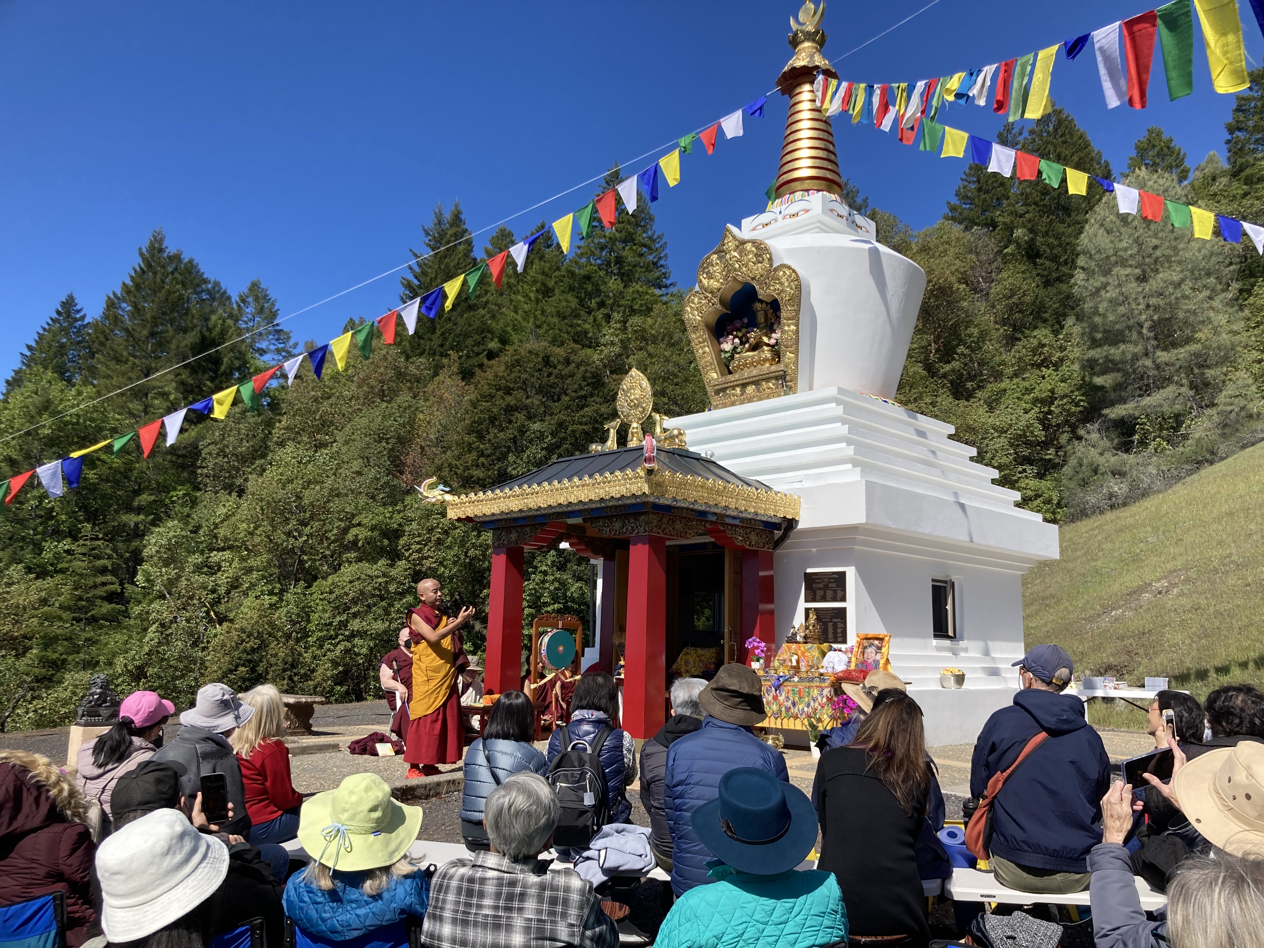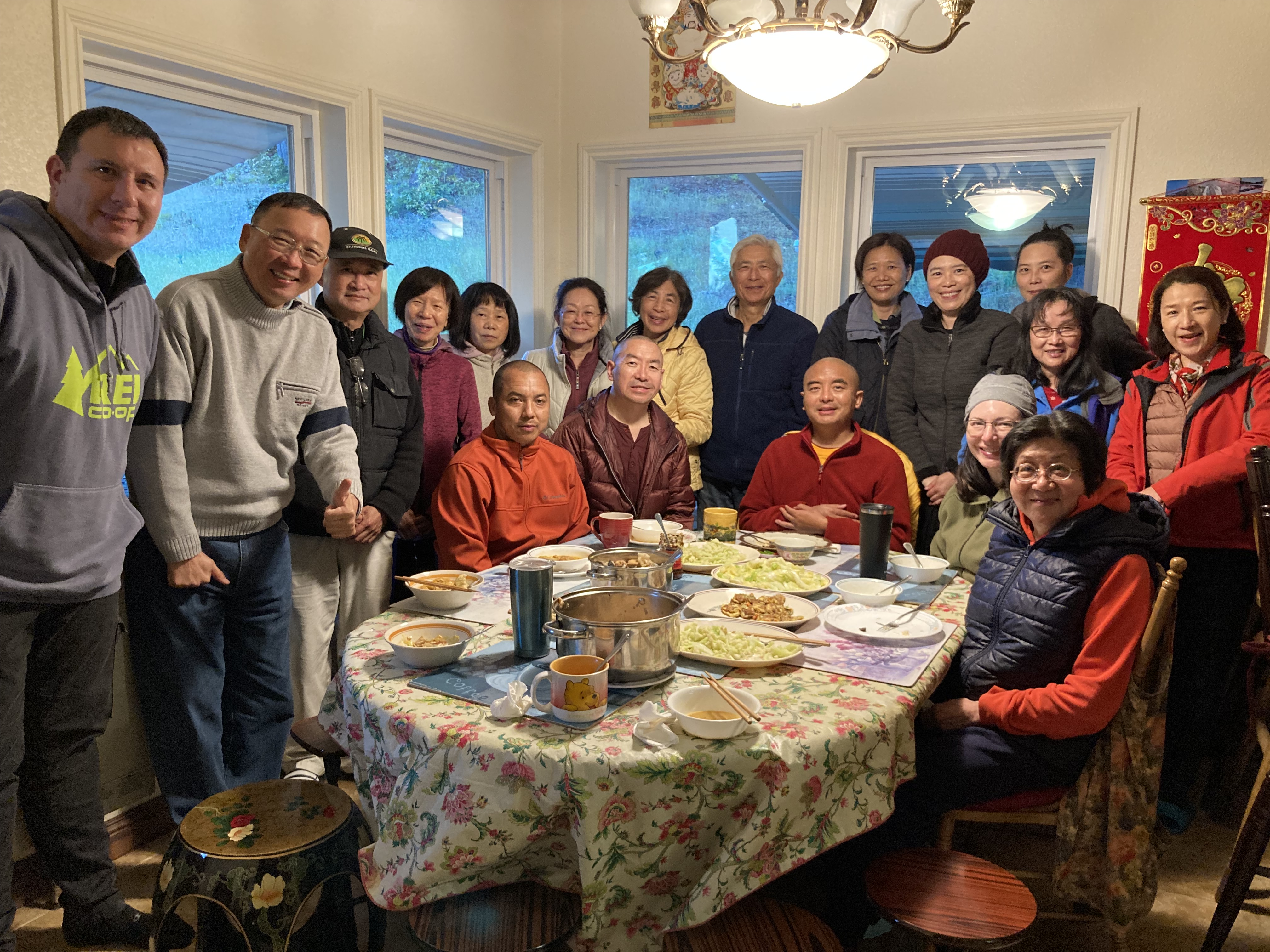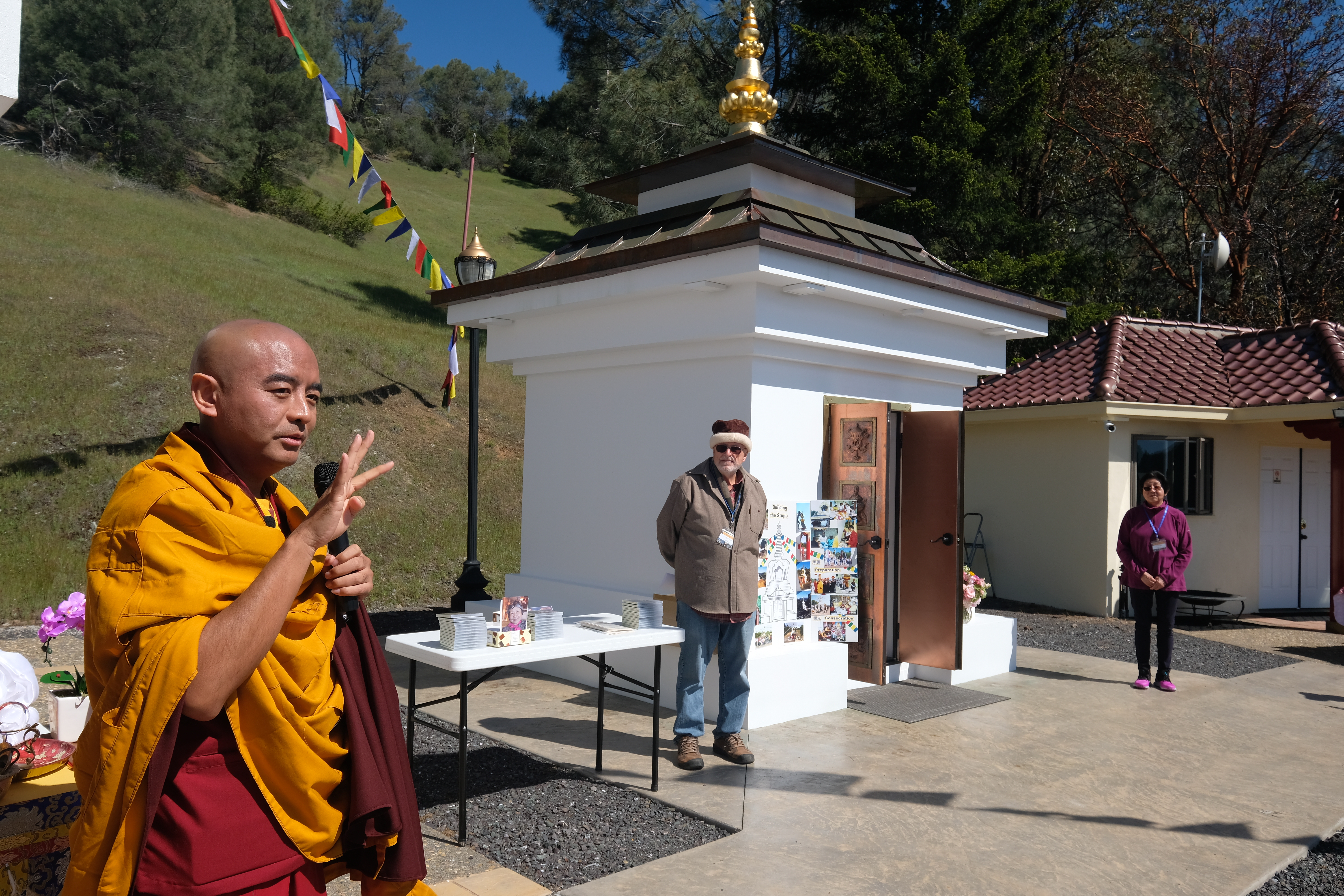 我們很高興的歡迎尊貴的詠給明珠多傑仁波切到訪吉祥金剛總持林閉關中心為多傑吉祥母紀念館舉行開光祝禱儀式。在開光祝禱儀式之前,5月8日星期日舉行了一場歡迎宴會,歡迎仁波切在三年的限制和封鎖之後的來訪。120多名學員和朋友們在Milpitas的五月花餐廳熱烈的歡迎仁波切。第二天早上,仁波切前往吉祥金剛總持林幫助詠給妙覺佛教中心的工作人員為開光祝禱儀式做準備。天氣又冷又下雨,但終於放晴了。