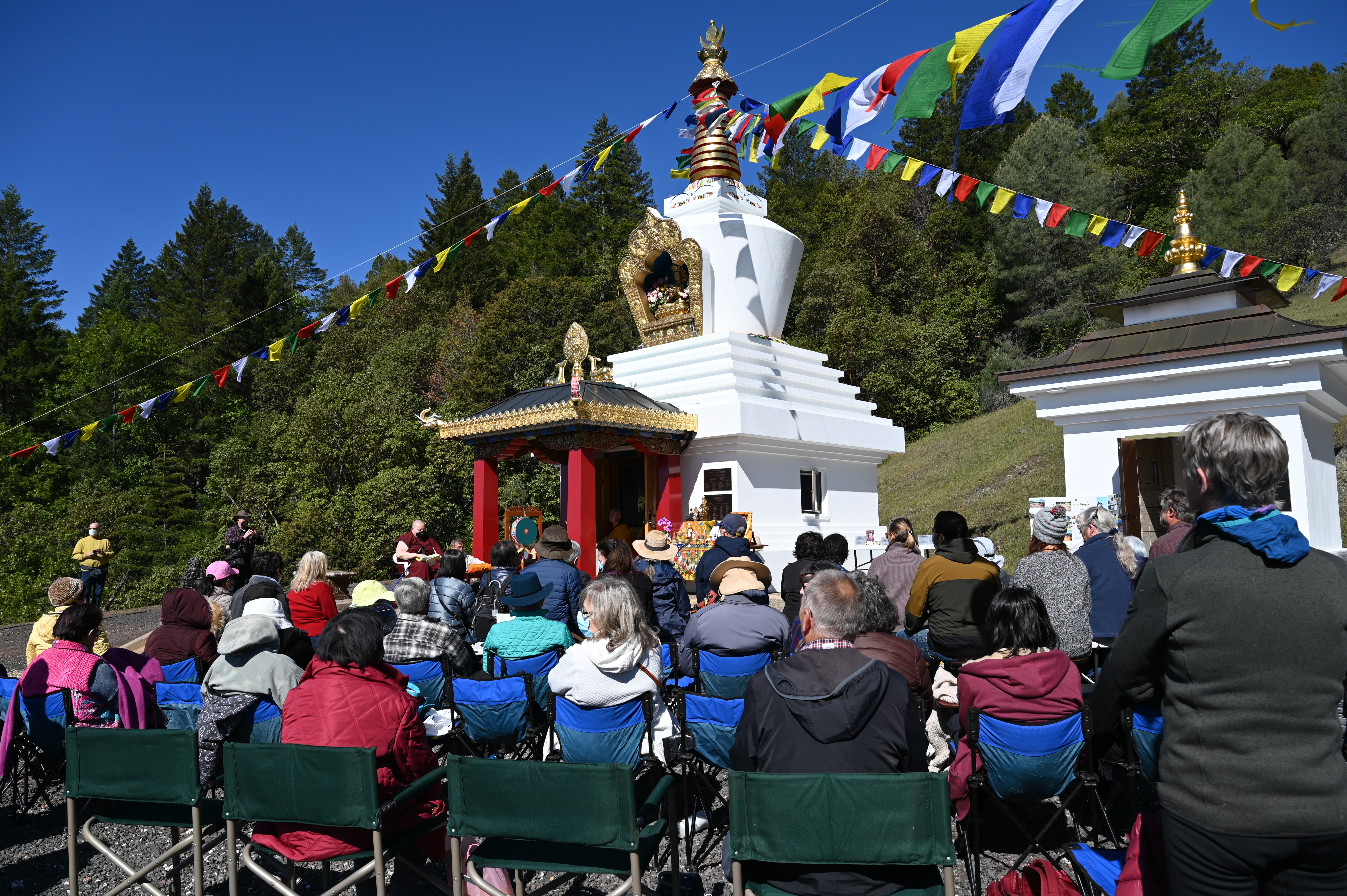 週三一早,超過100多名賓客來到吉祥金剛總持林閉關中心佛塔前參加念館舉行開光祝禱儀式。 協助仁波切做開光祝禱儀式的有Tsangsar Tulku, Lama Gyetso, Ani Kunzang, and 助手 Tashila 。