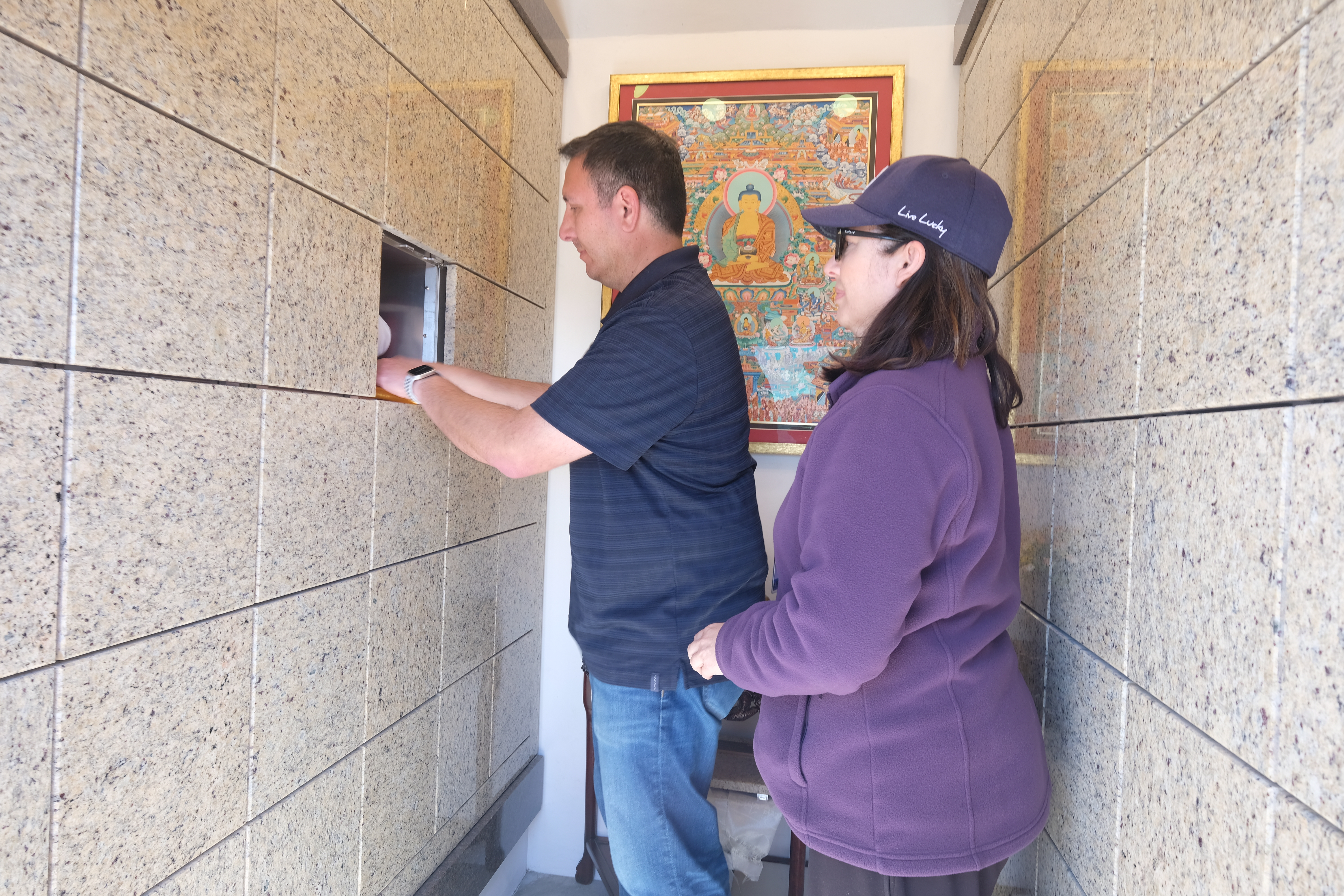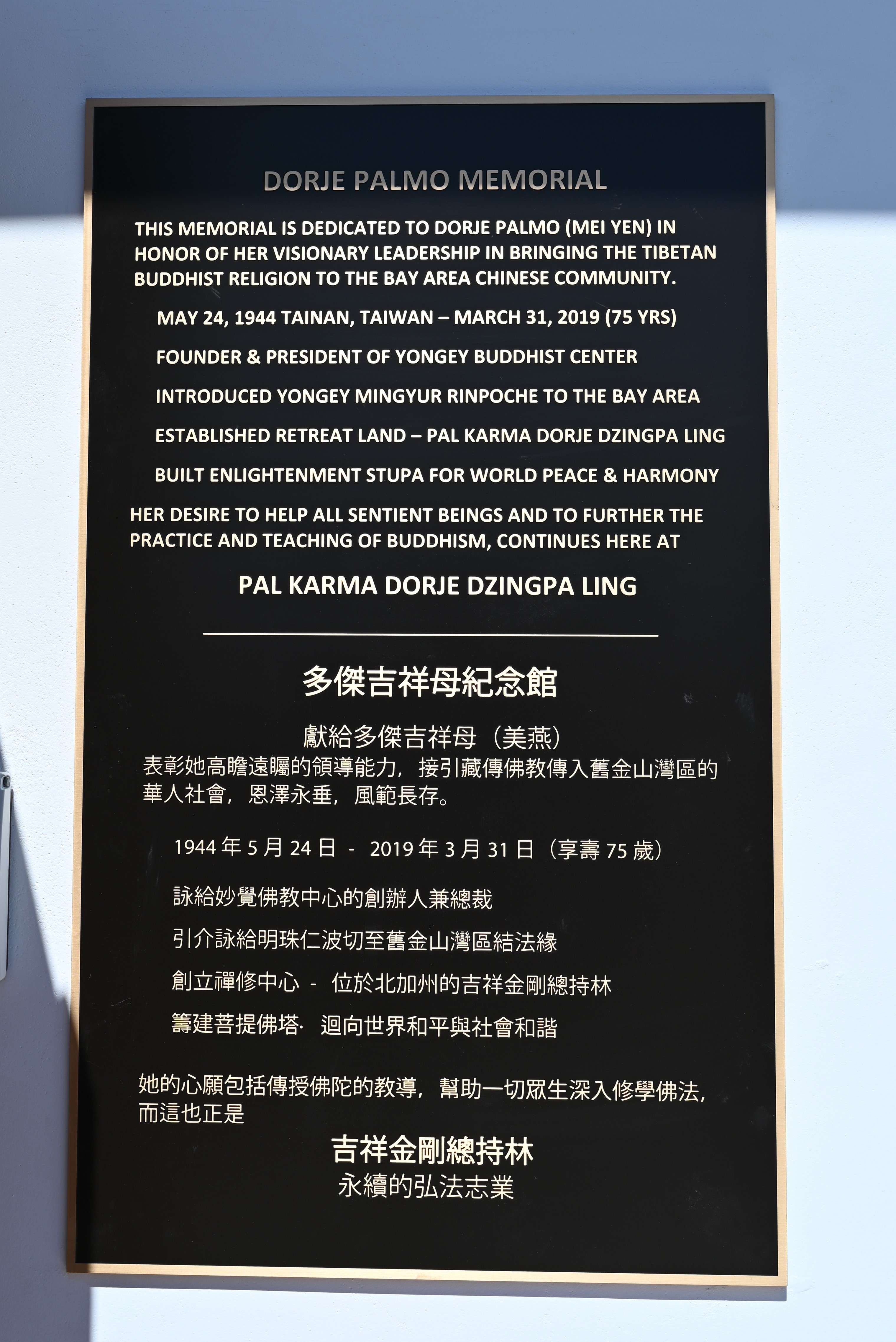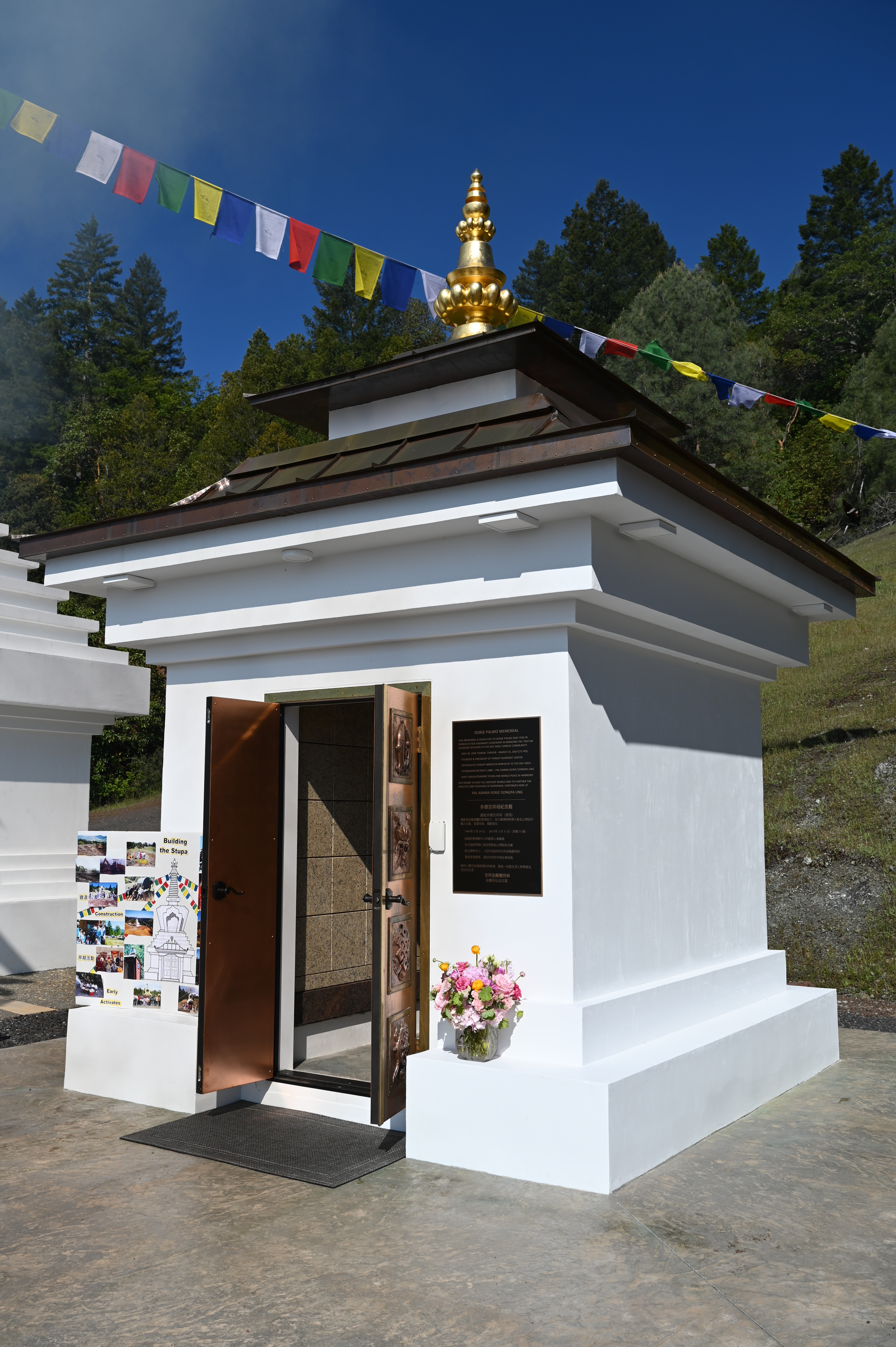 為多傑吉祥母紀念館舉行開光祝禱儀式以她的女兒蔣佳玲對多傑吉祥母(美燕)的悼詞開始。 丈夫蔣智勇隨後接著訴說一些美好愛的回憶,仁波切繼續闡述回憶和讚賞她的許多成就。 開光祝禱儀式隨後由非常尊貴的詠給明珠仁波切在多傑吉祥母紀紀念館前舉行,並在Tsangsar Tulku and lamas 的協助下進行。 作為儀式的一部分,仁波切帶領大家繞著佛塔和紀念館周圍,同時在風中撒蓮子和花瓣。隨着開光祝禱儀式之後,由兒子蔣忠孝將多傑吉祥母的骨灰罈安放在舍利塔內。